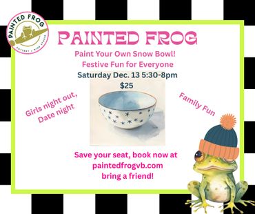 Welcome to Painted Frog, a unique pottery painting studio where creativity meets community. At our studio, we offer a vibrant space for artistic expression and also for hosting memorable meetings, creative workshops, and celebratory events for both individuals and business groups. Our delightful menu features an array of delicious items paired with a thoughtfully curated selection of wine, beer, and non-alcoholic beverages. Whether you're here to explore your creativity, forge meaningful connections, or simply enjoy our culinary offerings, we invite you to join us for an inspiring and enriching experience.
